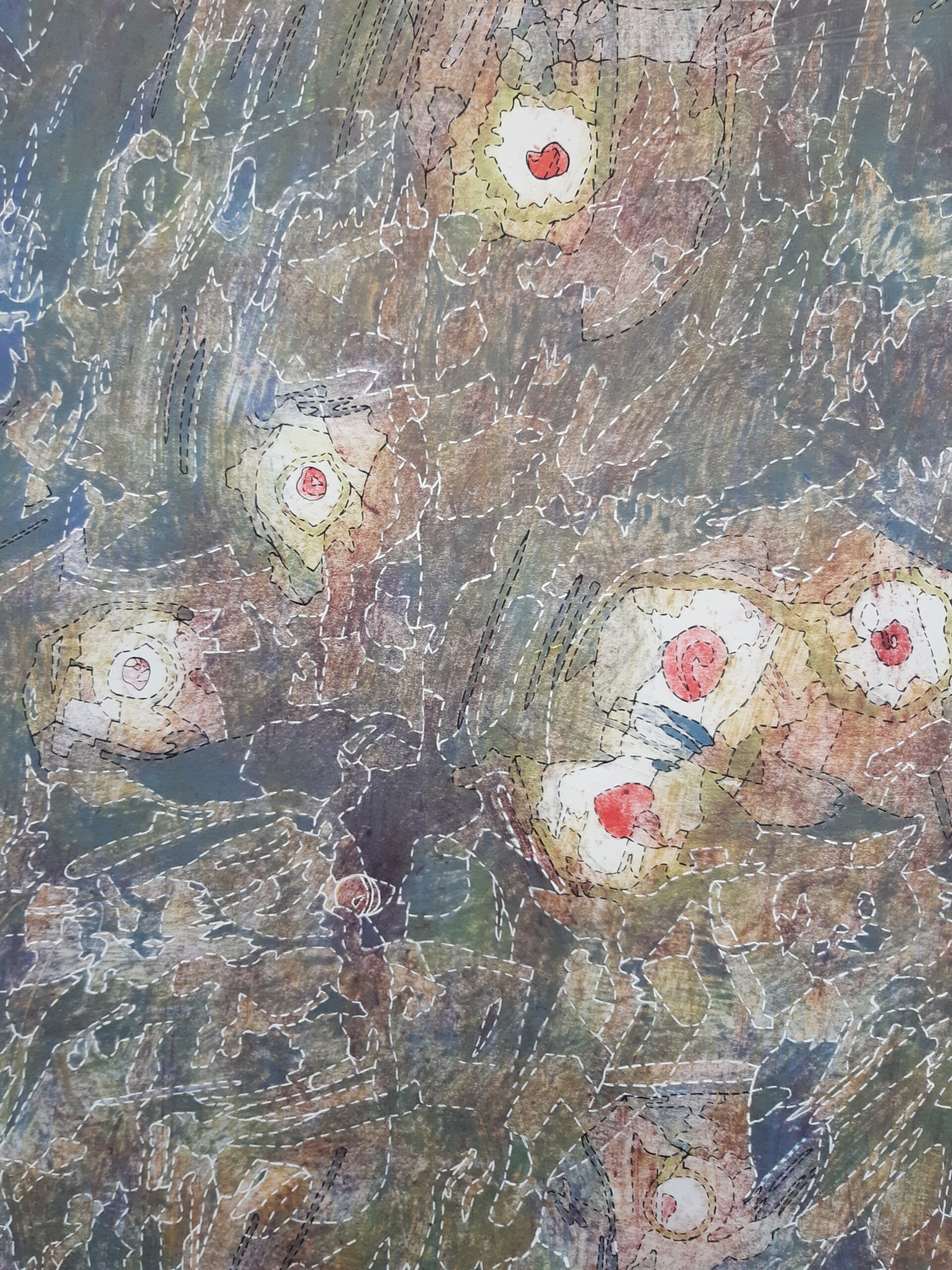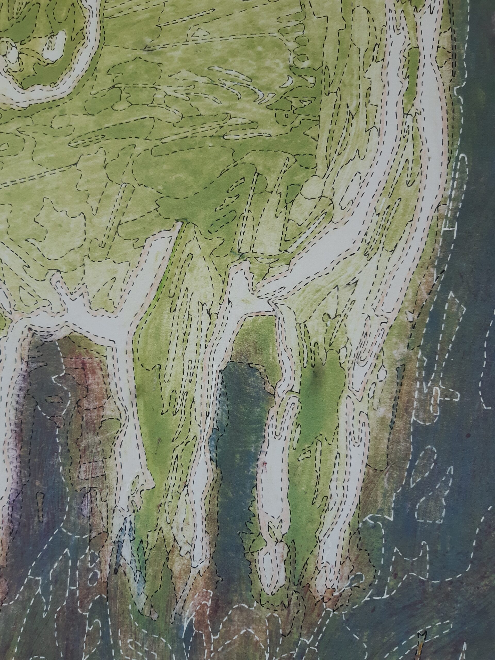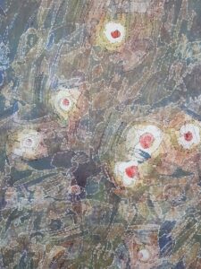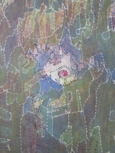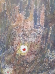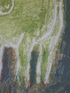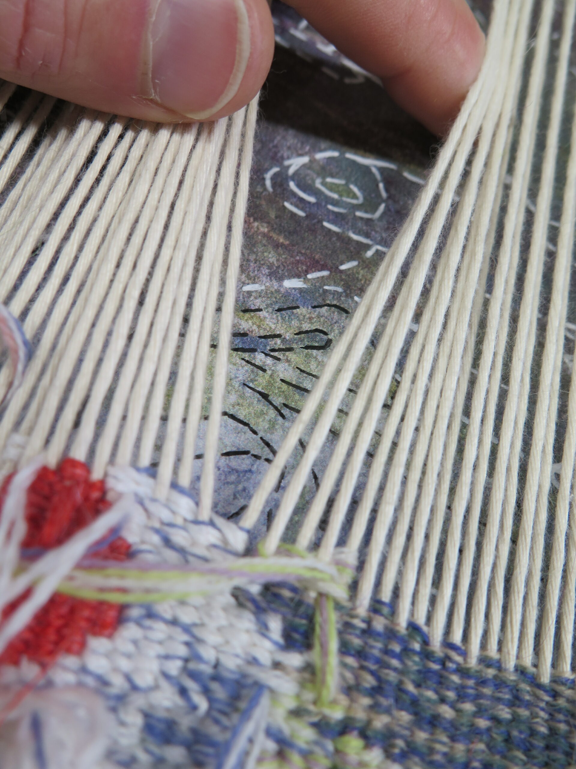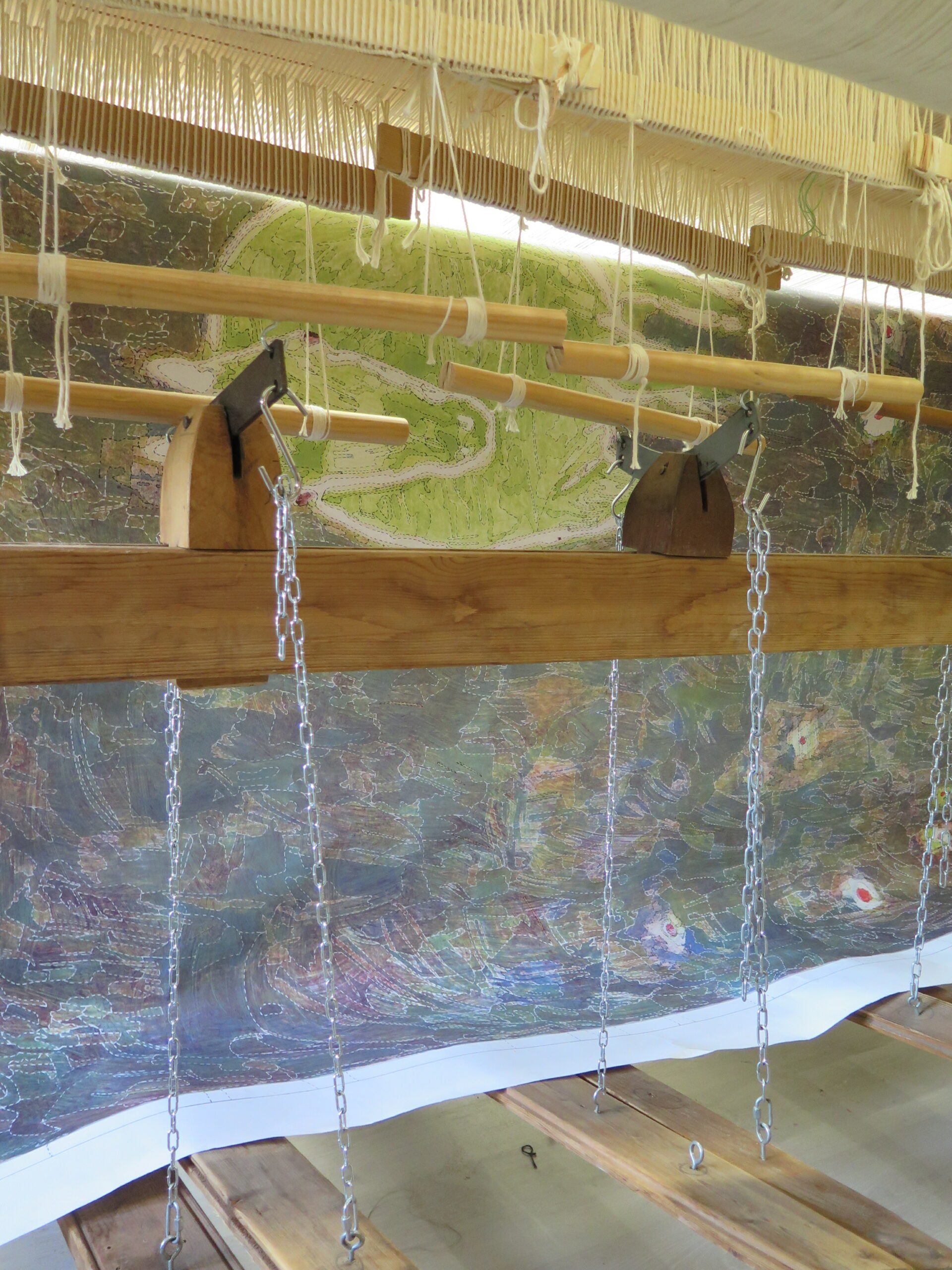 En effet, les choix de tracés ont dû être affinés tout au long de la phase de dessin. La maquette originale étant une lithographie réalisée par superposition de couches colorées, elle posait un défi technique particulier. Si les mélanges de laines permettent de créer des jeux de transparence, ils ne permettent pas toujours de traduire l’intégralité des superpositions propres à l’impression. Mon rôle a donc été de faire des choix en privilégiant certaines zones de couleurs et en soulignant les lignes de force, tout en simplifiant les zones trop complexes pour garantir une faisabilité technique du tissage.