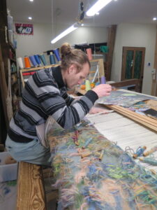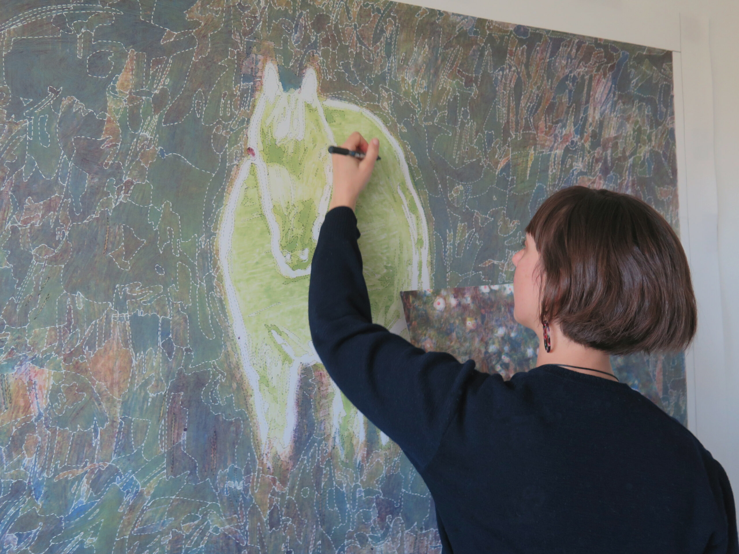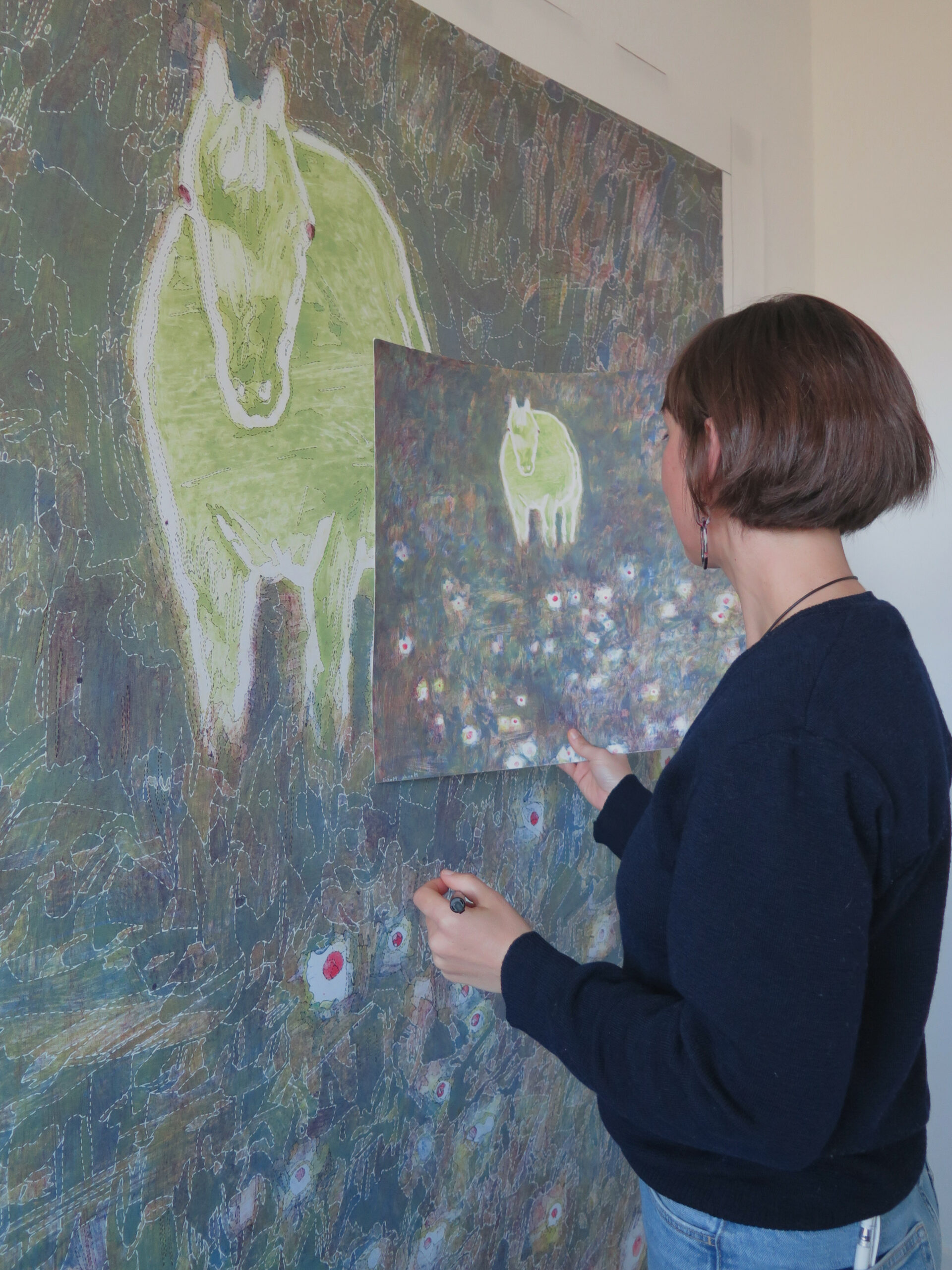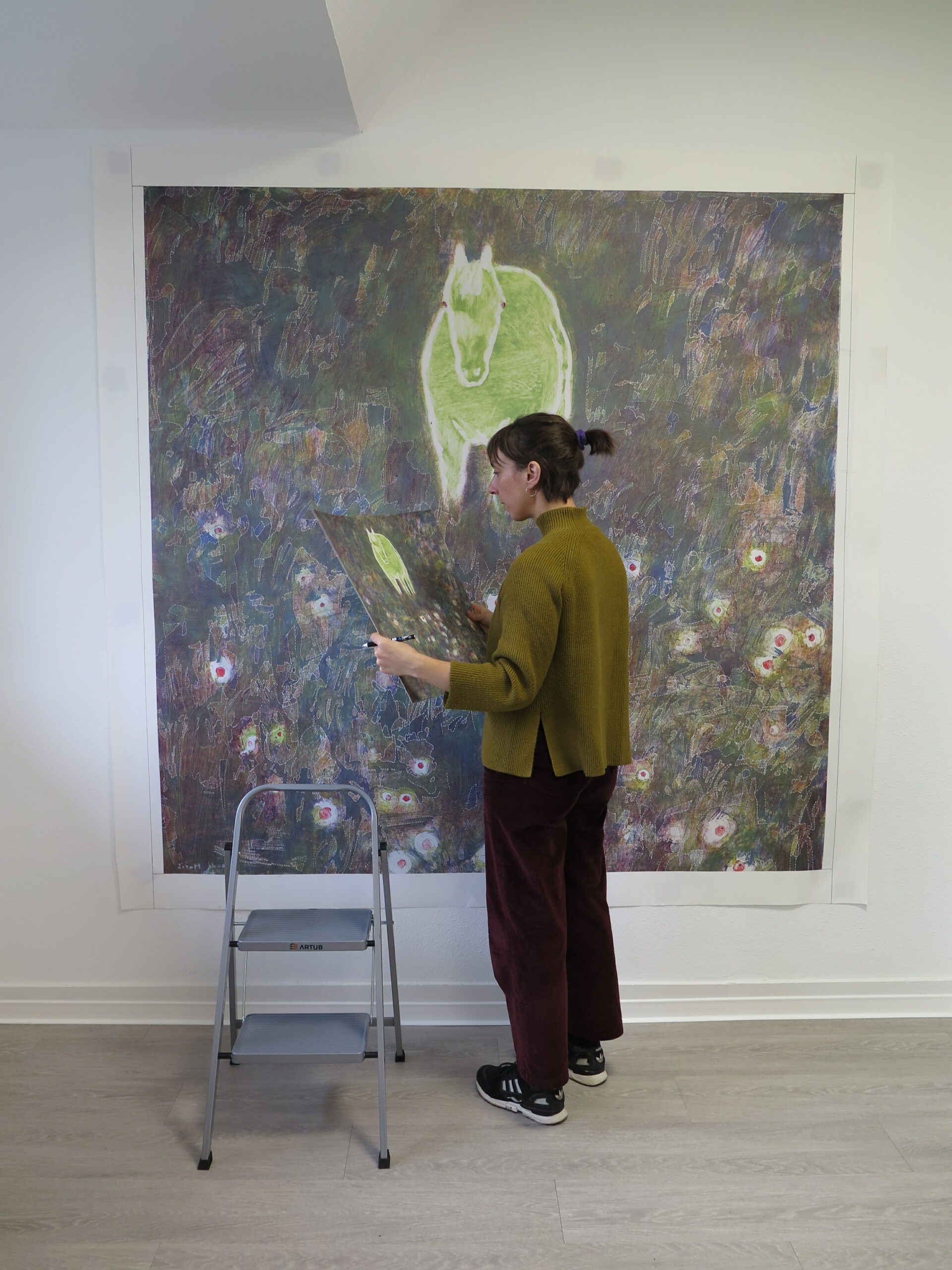 Pour ce projet ambitieux, Franck Castany m’a accordé sa confiance pour la réalisation du tracé du carton. Au démarrage du travail, je me suis installée dans son atelier afin de faciliter nos échanges. L’objectif était de m’assurer que la délimitation des zones de couleurs restait parfaitement intelligible pour lui, tout en définissant ensemble les éléments de l’œuvre à mettre en avant.