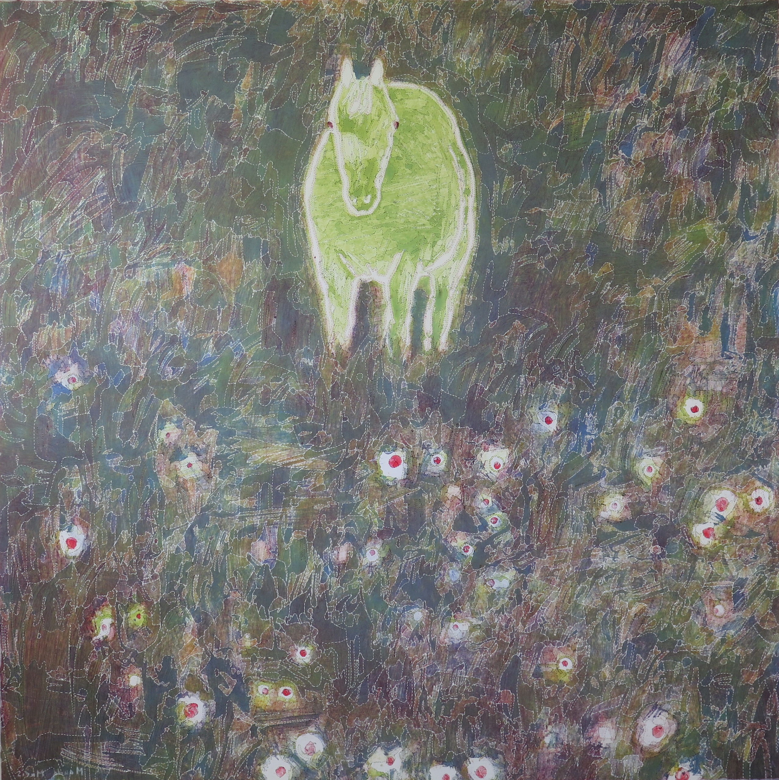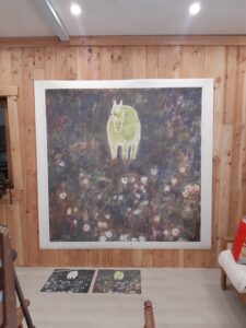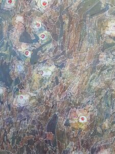 En phase avec la sensibilité de l’œuvre, Franck Castany de l’atelier La Rantiala a remporté l’appel pour le tissage de la pièce « Face et Fleur » de la peintre Maude Maris. Retenus pour la qualité de leur interprétation, les échantillons de Franck Castany ont su démontrer leur compréhension des enjeux artistiques de l’œuvre grâce à une juste utilisation des matières, des couleurs et des écritures techniques.