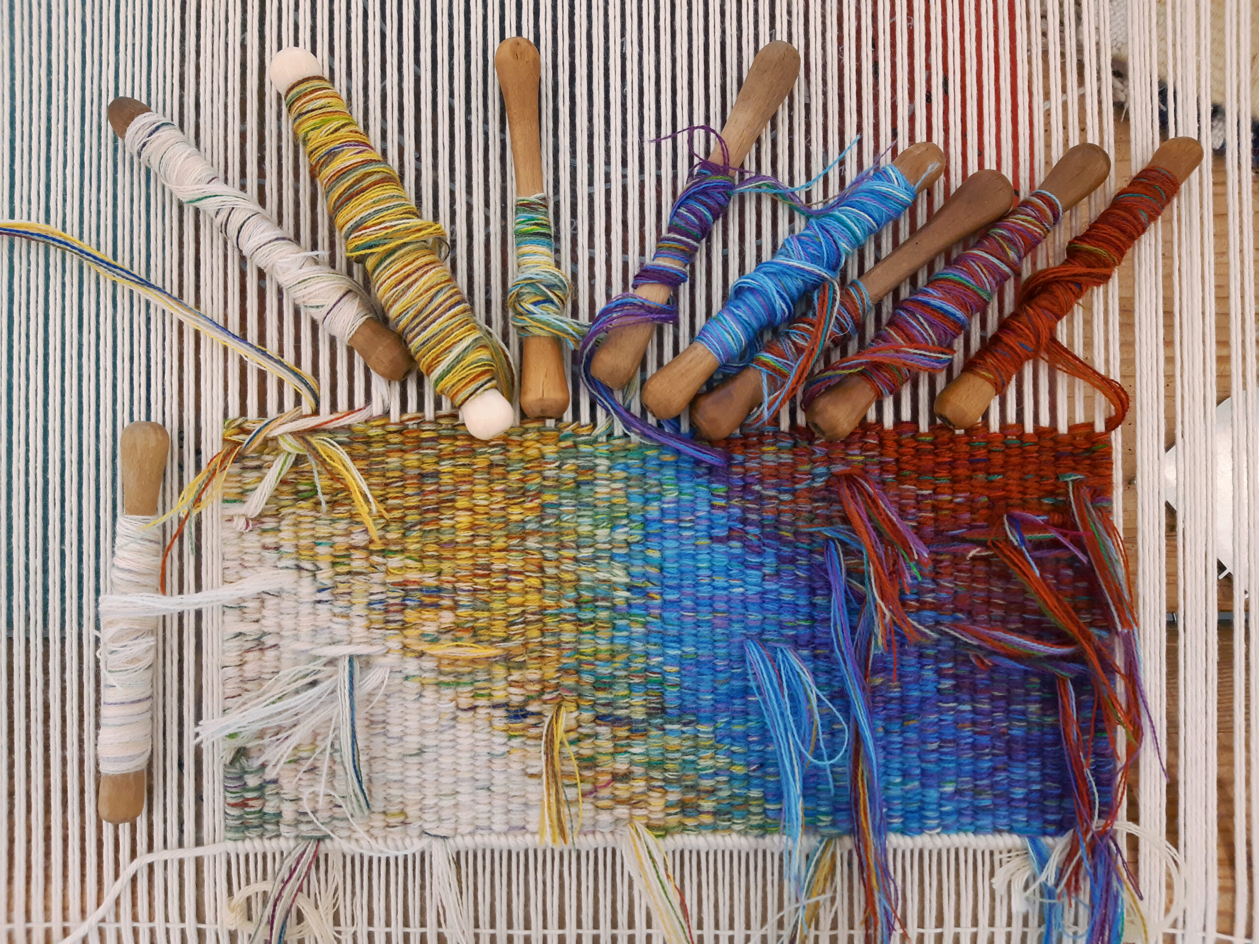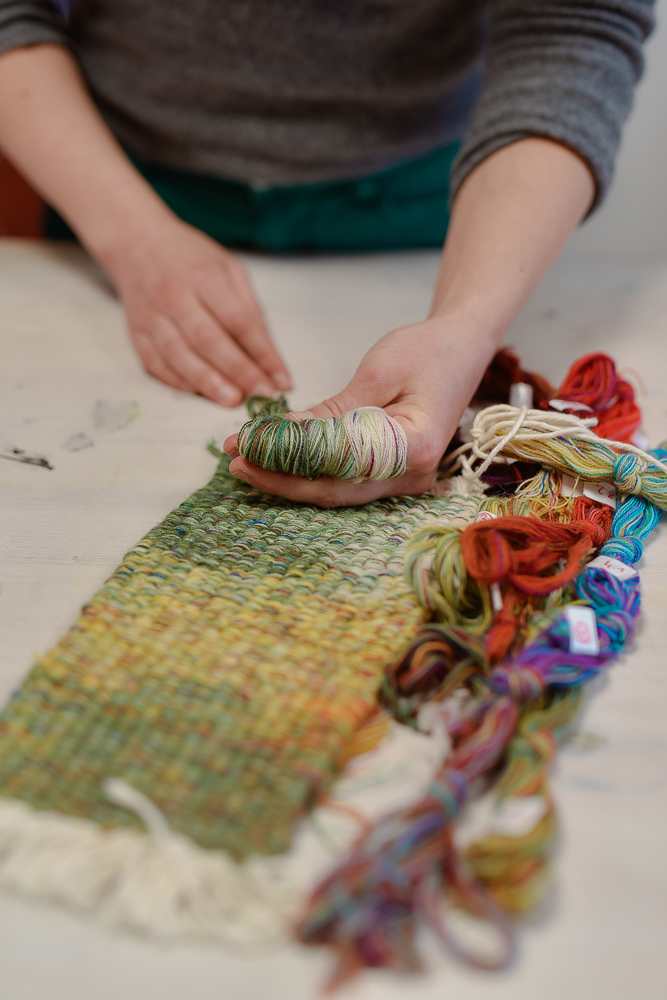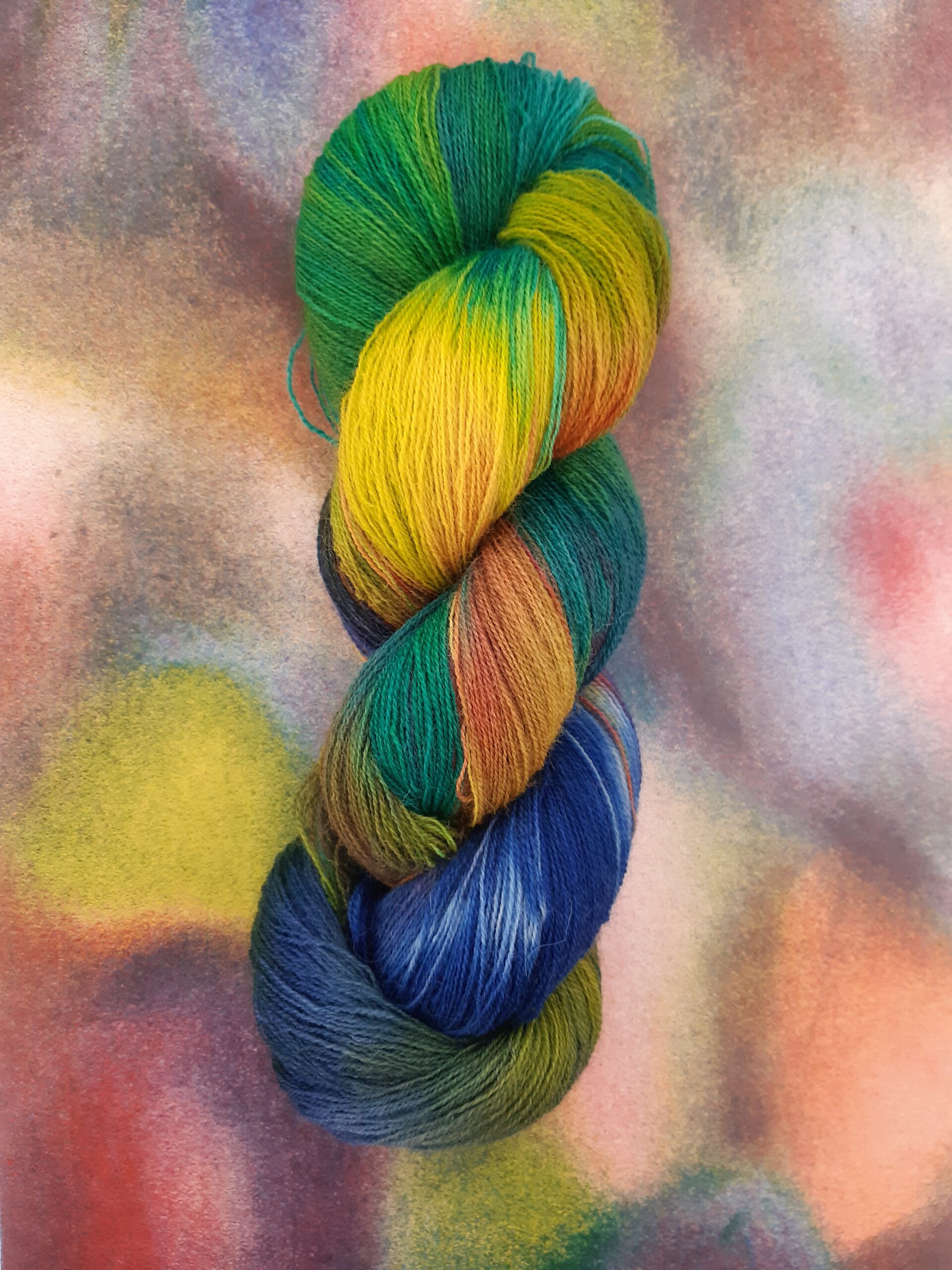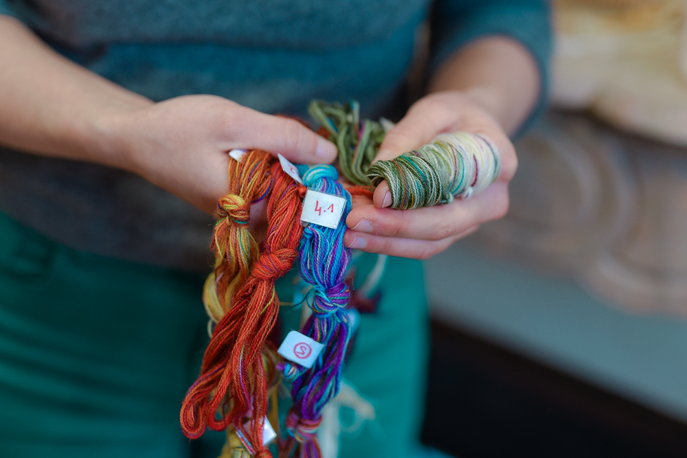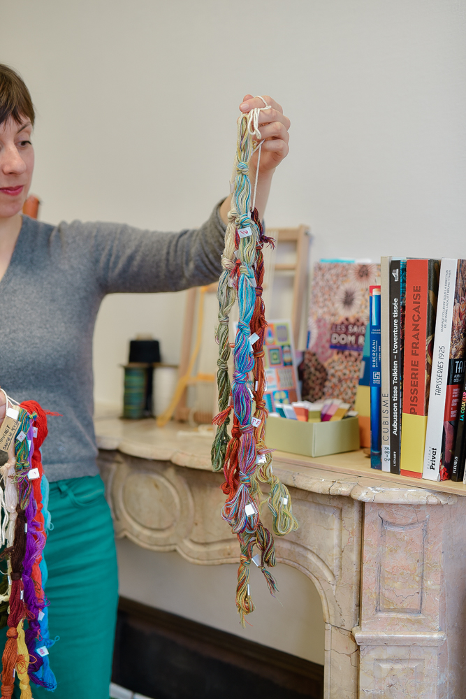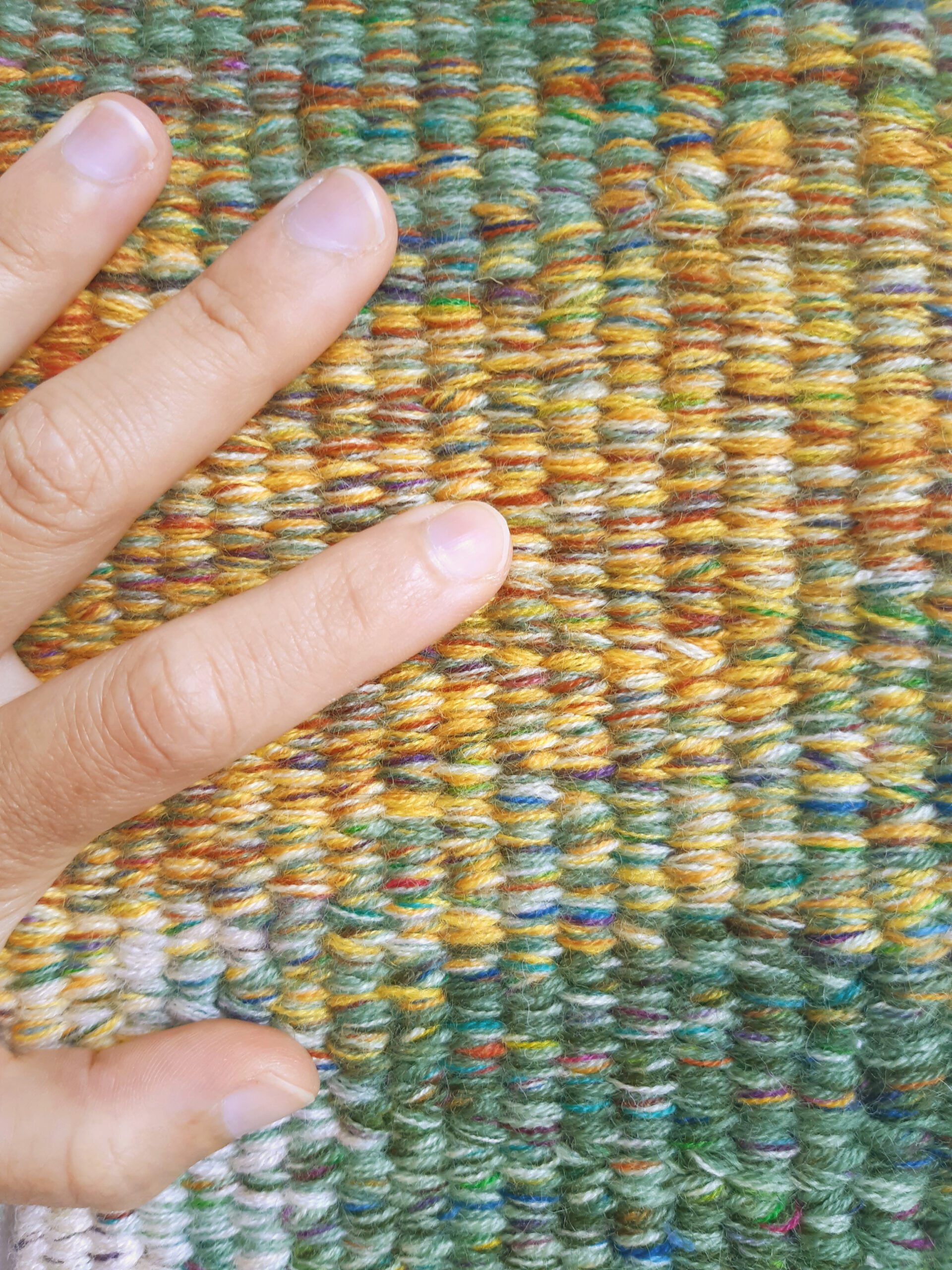 La laine tavelée est un fil de laine teint de plusieurs couleurs sur le même fil. Pour sa teinture, l’écheveau est trempé successivement dans des bains de couleurs différentes, jusqu’à coloration complète, pour ce projet la laine tavelée provient de l’atelier aubussonais Teinture Aubusson Lab.