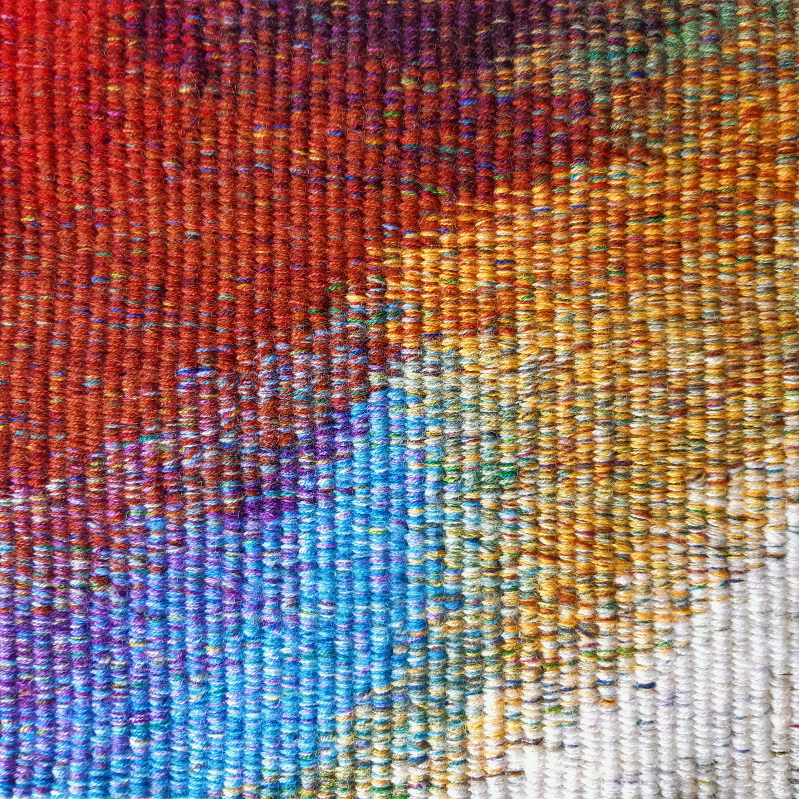 En 2020, j’ai découvert le travail de Lisa Mouchet à Marseille. La Galerie Studio Fotokino présentait alors son livre tout juste paru, « Le Mystère de la Maison Brume ». Tâches de couleurs vives, halos qui se superposent, effet poudré, pixellisé… l’œuvre « Brume de pensée » m’a très vite inspiré son interprétation en tapisserie.