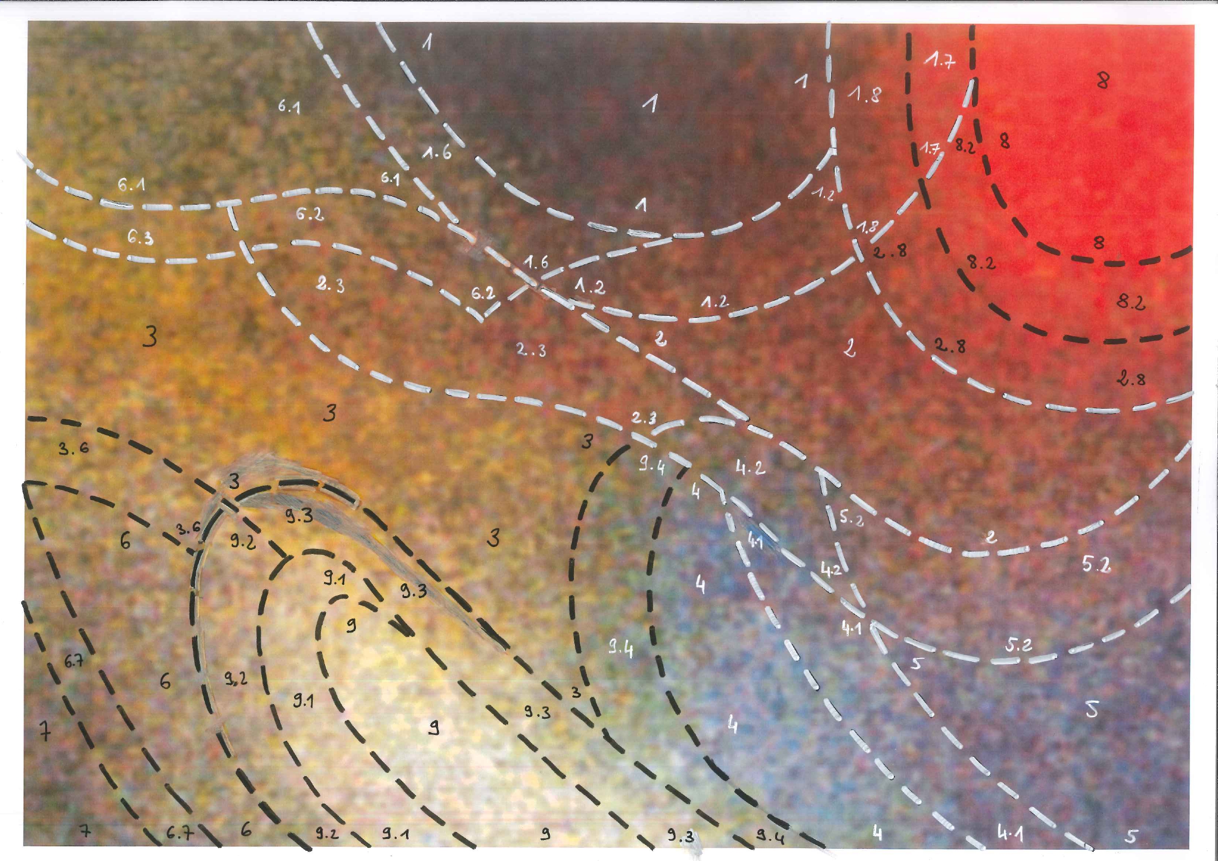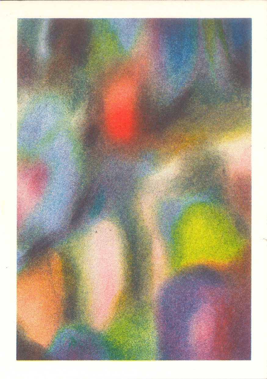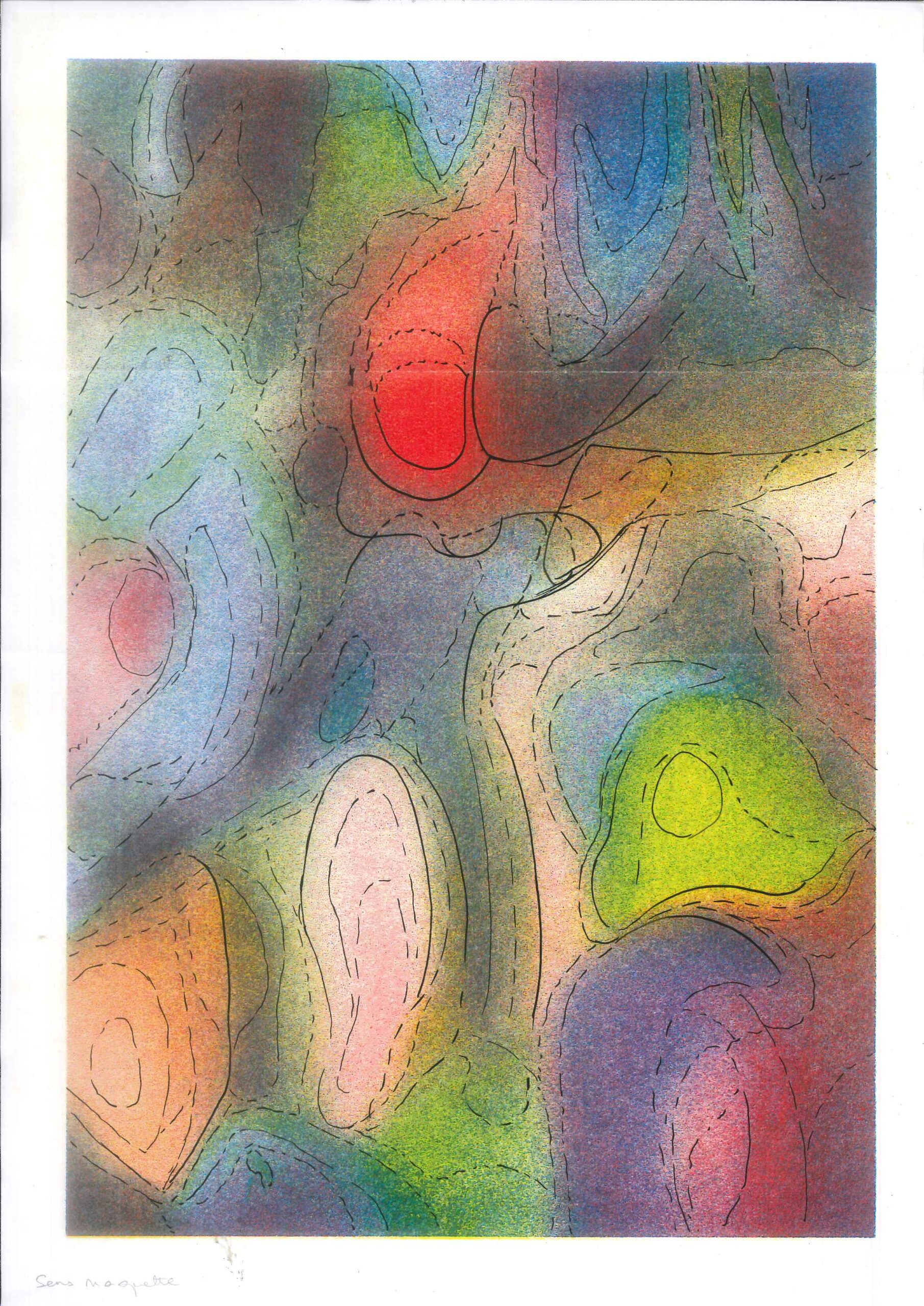 L’interprétation de « Brume de pensée » en tapisserie s’inscrit dans la continuité de la multiplication des transpositions techniques qu’a subie l’image à l’origine de l’œuvre. Photo floue reproduite au pastel sec, pastel reproduit en risographie (avec deux traitements différents)… je me propose de poursuivre ce jeu de transposition en tapisserie.